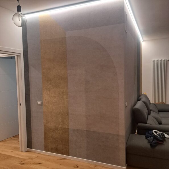 Continuità Visiva: L'uso delle stesse finiture e palette cromatiche, tonalità neutre e naturali arricchite da un tocco di colore deciso con la scelta di una carta da parati elegante e e discreta, assicura un senso di unità e coerenza progettuale in tutta la casa.